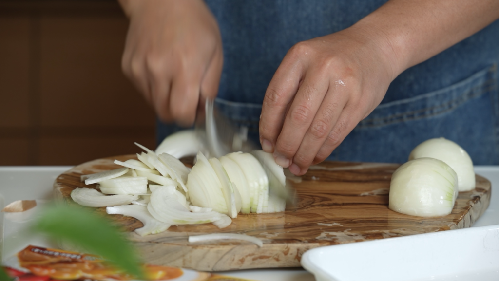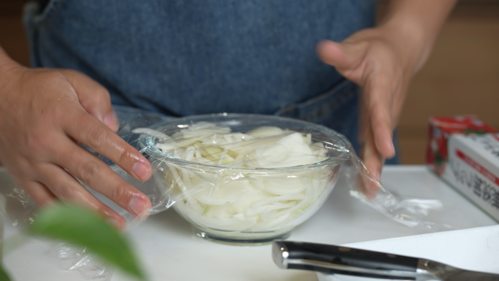 玉ねぎを薄切りにし、耐熱皿に入れて電子レンジ(600W)で5分加熱します。