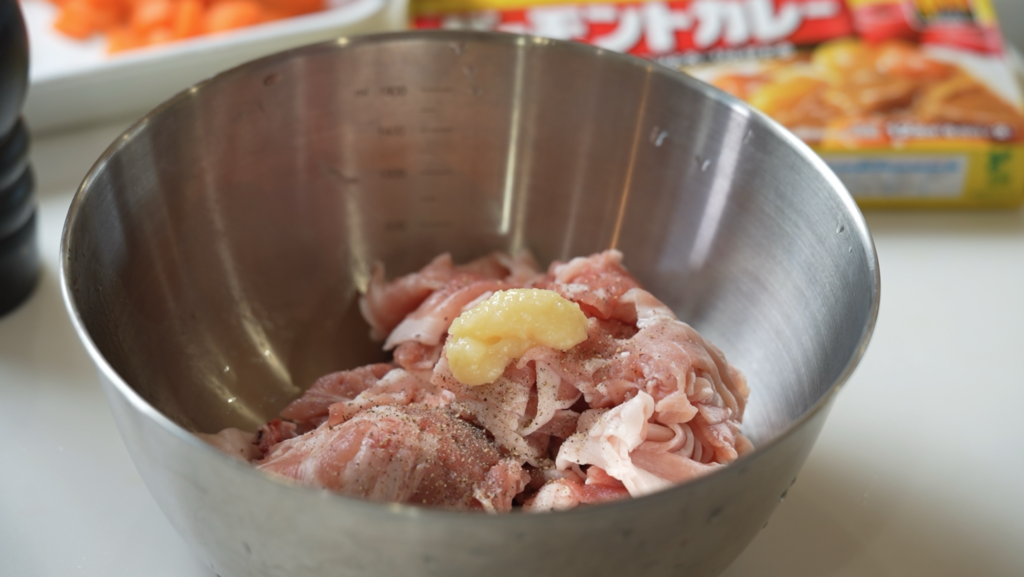 ここが超重要!お肉に塩コショウとおろしにんにくを揉み込みます。