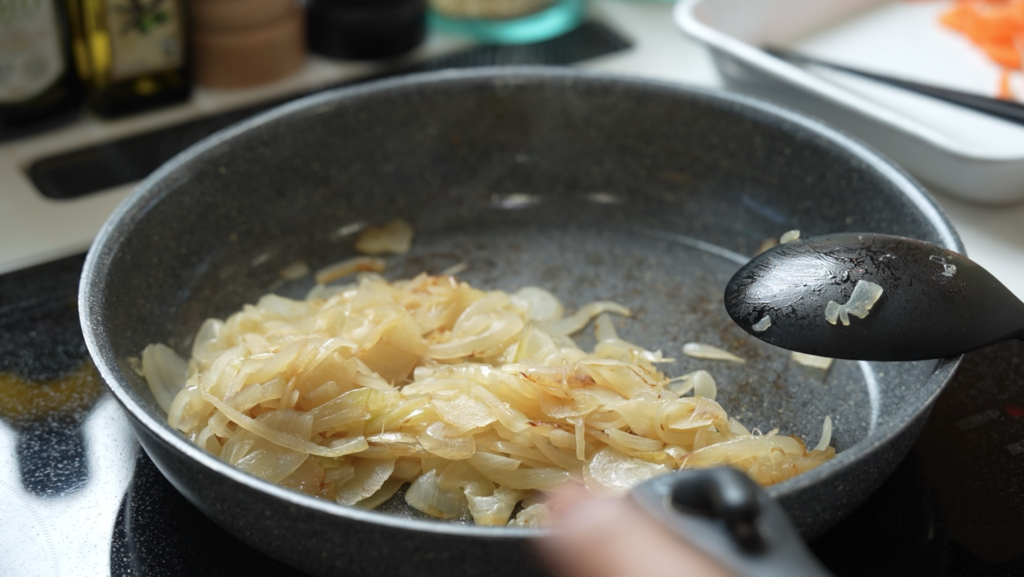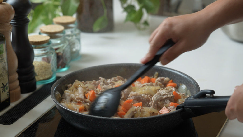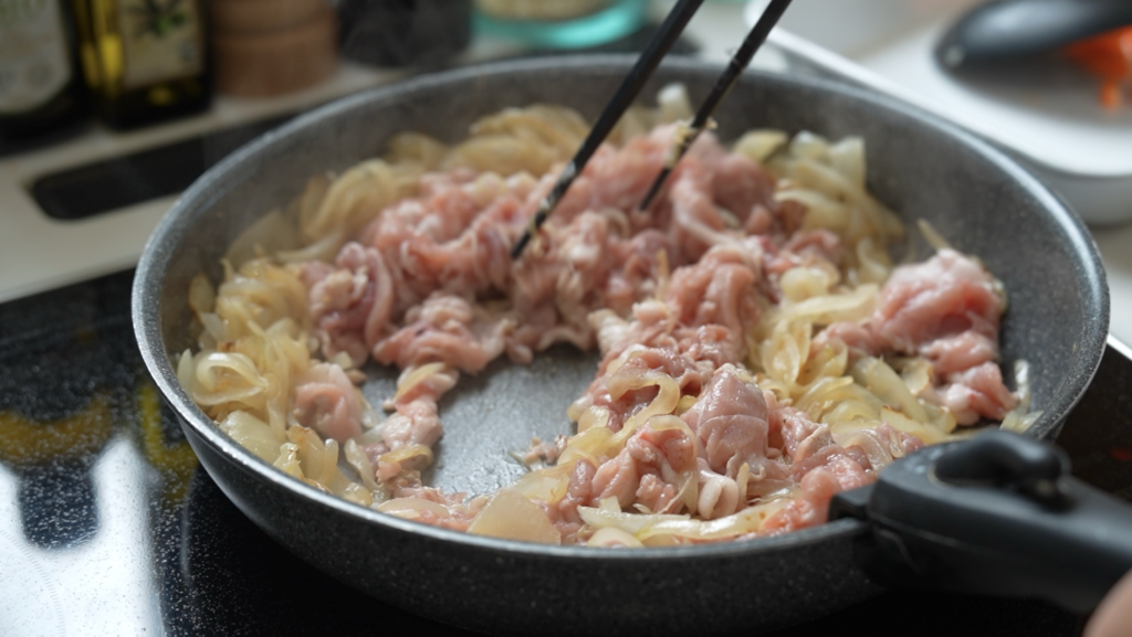 フライパンで玉ねぎを狐色になるまで約10分炒めたら、お肉とニンジンを投入します。