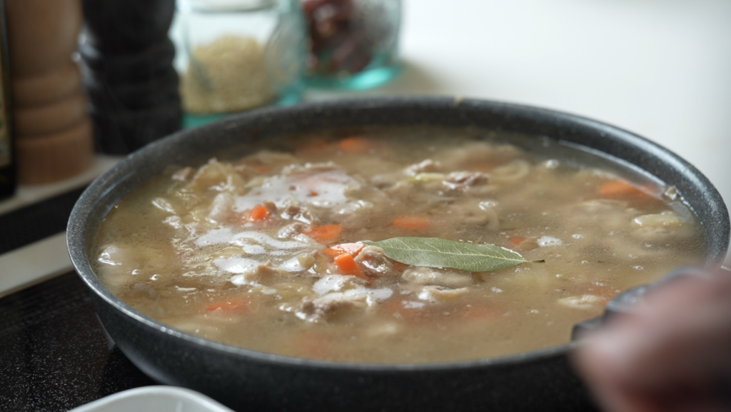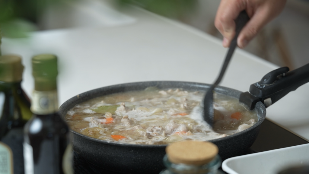 沸騰したらアクを丁寧に取り、具材(特にニンジン)が柔らかくなるまでじっくり火を通します