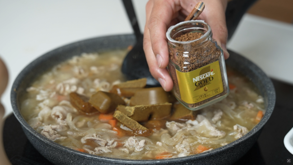 ルーが溶けたら、インスタントコーヒーとオイスターソースを加え、弱火で5分ほど煮込みます。