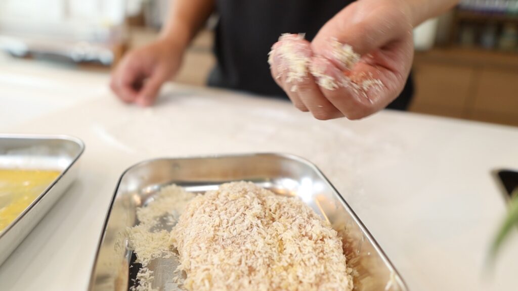小麦粉→卵→パン粉の順番にお肉をくぐらせ衣をつける