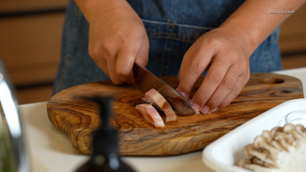 ベーコンやしめじなど、お好みの具材を適当な大きさにカットして準備する