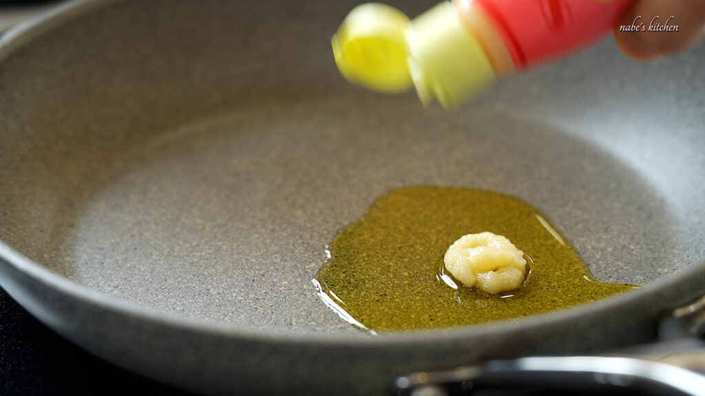 フライパンに油とにんにくを引き、具材をしっかりと炒めて旨みを引き出す