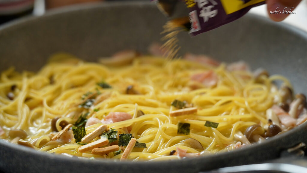 茹で上がる直前になったら「松茸の味お吸いもの」の粉末を入れ、全体によくなじませる
