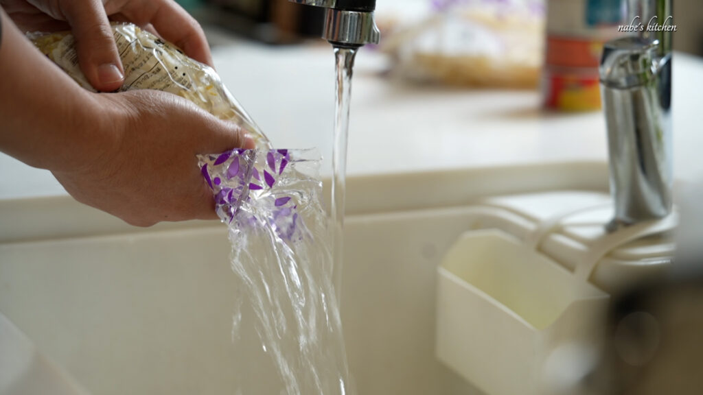 もやしを耐熱容器(または袋のまま)に入れ、レンジ(600w)で約2分半加熱する