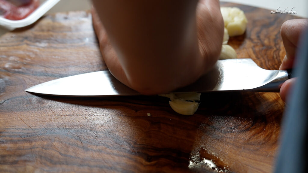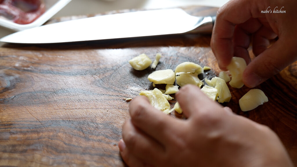 にんにくの皮を剥き、潰して大きめのざく切りにする