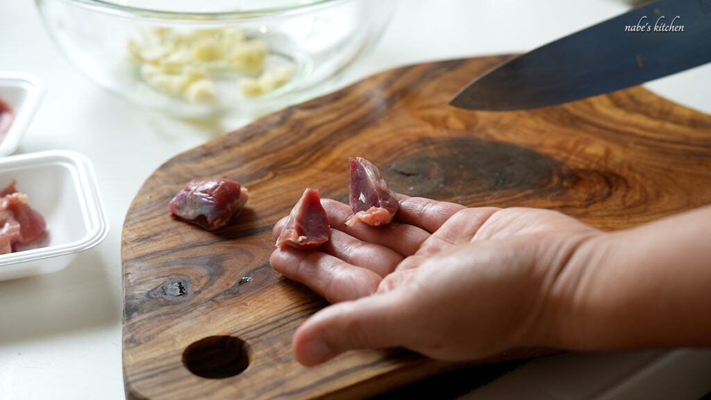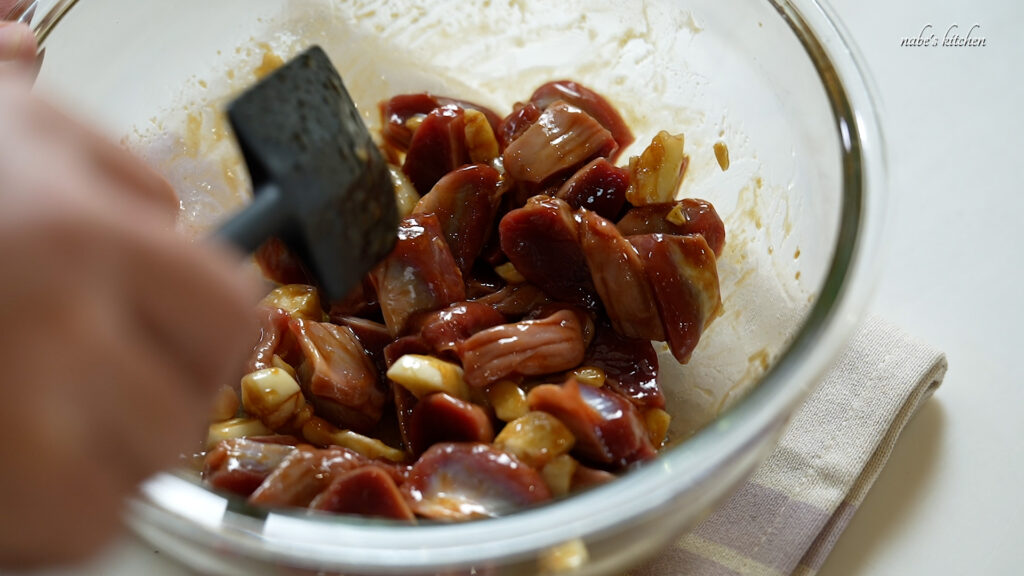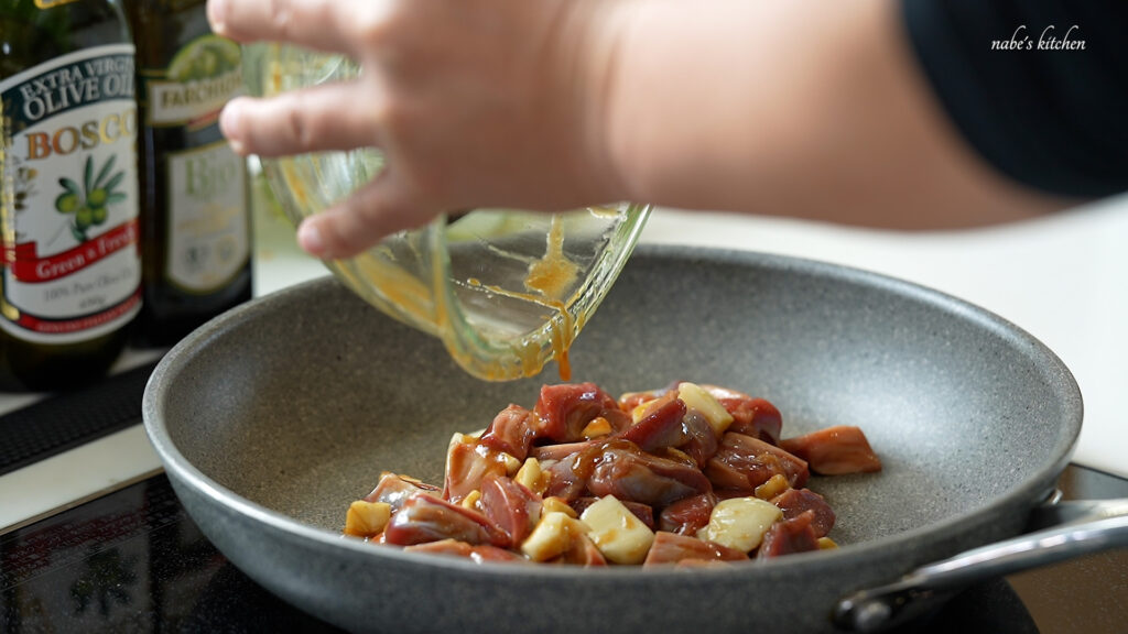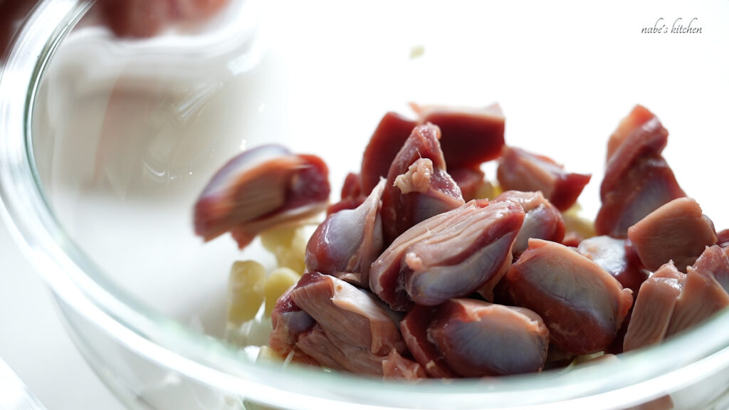 にんにくと砂肝をボールに移し、調味料を絡める