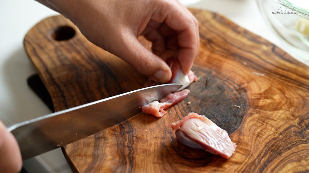 砂肝を半分に裂き、周りのブニョブニョした部分を取り除く