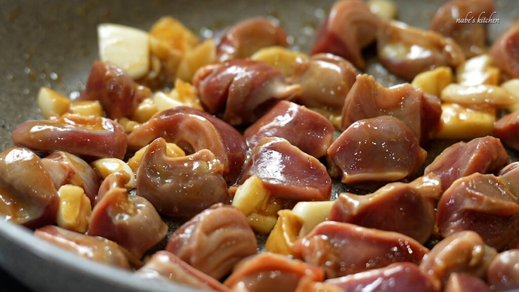 中火のフライパンで砂肝に火が通るまで炒める